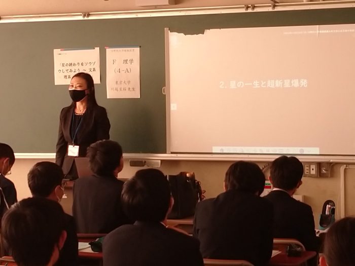 - 川越先生より、天文学に関する授業が行われました。 - はじめに星の一生と超新星爆発のメカニズムについて、ニュートリノの観測や、ニュートリノ望遠鏡であるスーパーカミオカンデの構造もまじえて説明がありました。次に、超新星爆発と私たちの体の成分の関係について説明がありました。私たちの体を作っている成分はすべて星の中にあるものでできており、まさに「私たちは星屑から生まれた」といえます。最後に天文学とSDGsについて話がありました。 - 生徒は、終始一生懸命に聞いており、大学の概要や、今高校で学んでいることがこれからどのように活きてくるのか、なぜ必要なのかについても学ぶことができたようです。