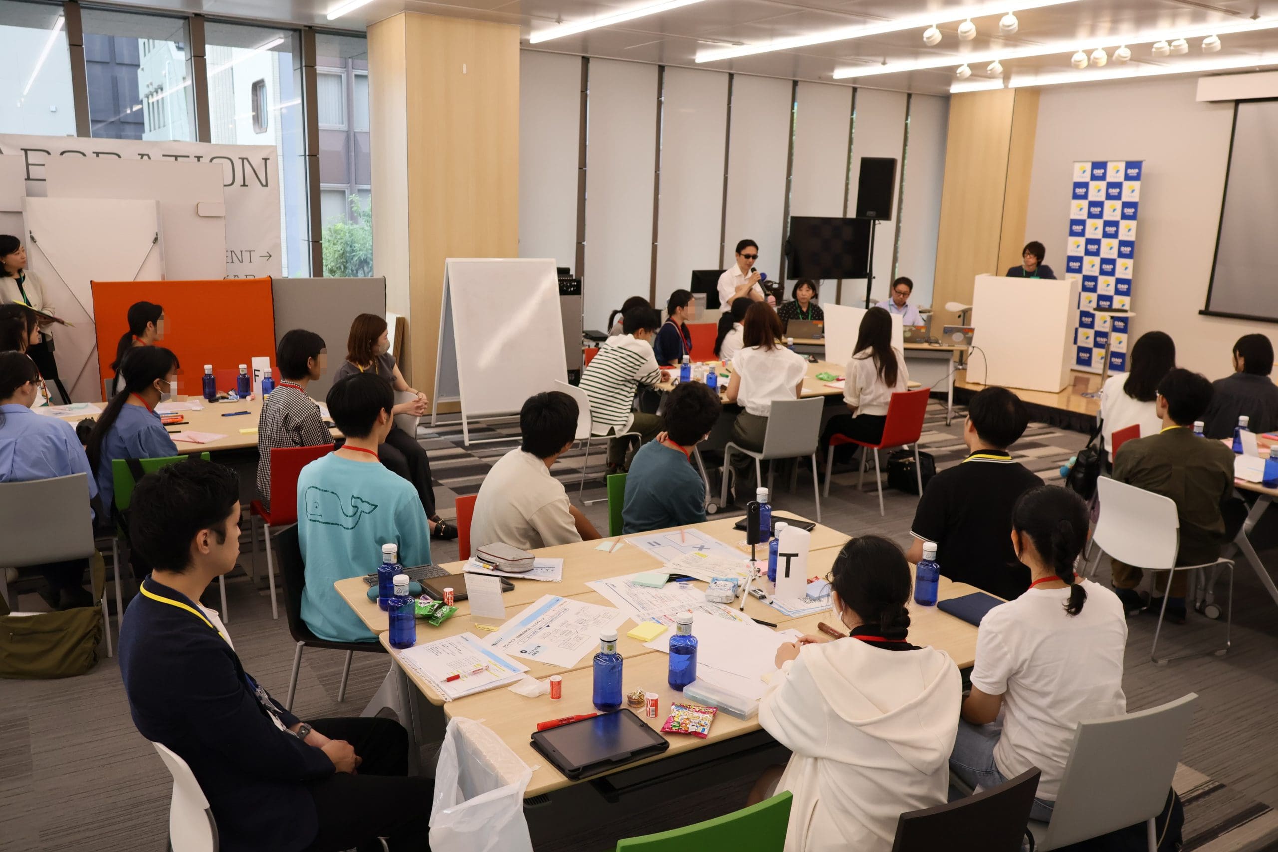セッション①(本所 ホワイエで開催)では、ONGのメソッド及び教材を使用した各グループのチームビルディングからスタートしました。続くセッション②(本所 ホワイエで開催)では、本学 先端科学技術研究センターの熊谷 晋一郎 教授と、ユニバーサルデザインコーディネーターとして活動されているGRIC(グリック)代表の高橋 純也 氏を迎え、当事者講演・疑似体験を通じ、ユニバーサルデザインを自分事化するワークを行いました。セッション③(DNP本社で開催)では、個々が見つけた社会課題をユニバーサルデザインの視点から解決するアイデア創出を行いました。セッション④(DNPプラザで開催)では、これまでに考えた案を全体で共有・改善案の再検討を行い、互いに意見を出してまとめていく活動を行いました。